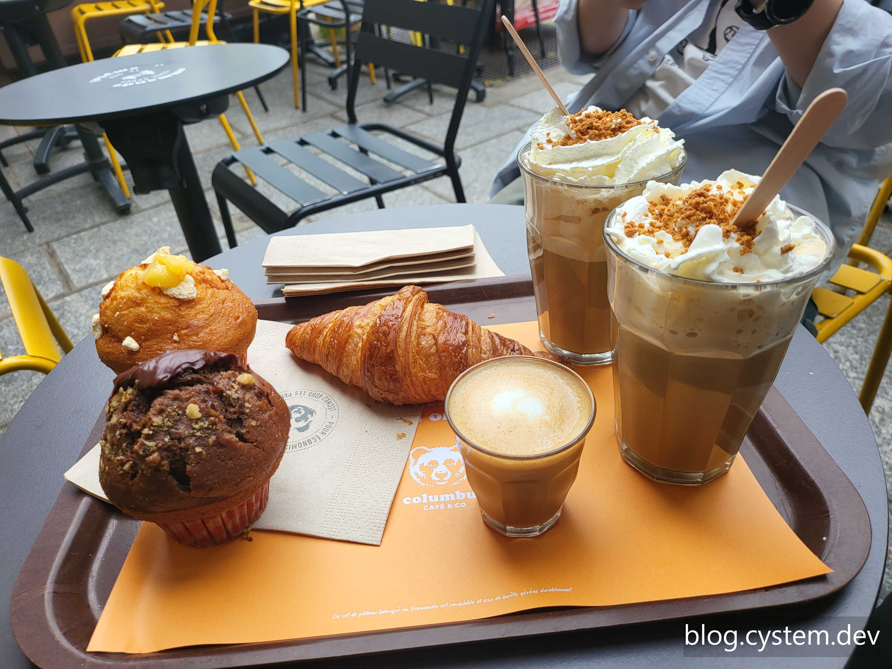 머핀과 크루아상 커피를 각각 시키고 빵은 나눠먹었다.
